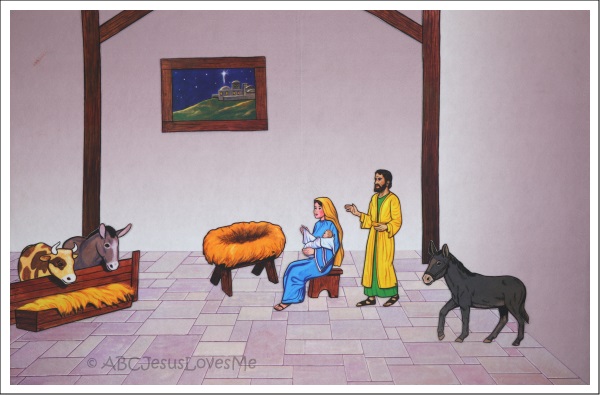 People had been waiting and waiting for a very long time. As a matter of fact, people had been waiting ever since the first man and woman had to leave God’s special garden because they had disobeyed God. Do you remember the name of the first man and women? (Adam and Eve) They were waiting for God to keep His promise. God had promised to send them a Savior, someone who could make everything good and right again. One day an angel spoke to a girl name Mary and told her she would have a baby. Then the angel spoke to a man name Joseph, who was going to be Mary’s husband. The angel told Joseph that Mary’s baby was special. He was God’s son, Jesus! While Mary and Joseph were waiting for Jesus to be born, they had to go on a long trip. The ruler of the land had made a law that people had to go to their hometowns and write their names in a special book so that leaders could count how many people there were. So Joseph and Mary had to travel to Bethlehem to be counted. They had to walk all the way! Finally, they arrived in Bethlehem. Mary was ready to have her baby! But Bethlehem was so crowded they couldn't find a place to stay! Everywhere they were told, “There is no room!” Finally a kind innkeeper said they could stay in his stable with his animals. And just in time, too! That night Jesus was born. Mary wrapped the baby with pieces of cloth and laid Him in a manger to sleep. All the angels joined in and said, “Glory to God! Peace on earth to those who love God!”